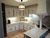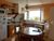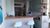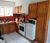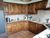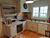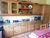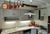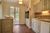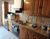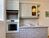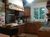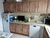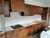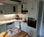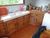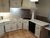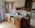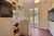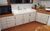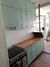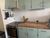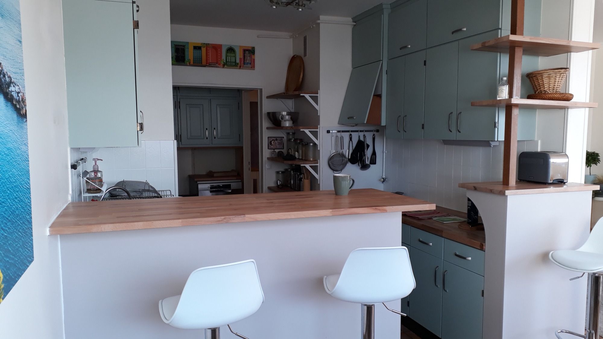 Retrait des étagères et création d'un comptoir avec tabourets, peinture des éléments en vert et lin + changement des poignées