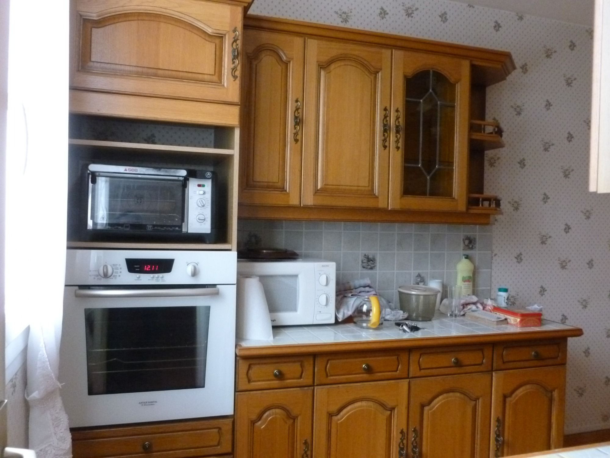 Peinture des éléments en kaki clair, remise en place des boutons d'origine, fabrication et pose d'une porte au dessus du four